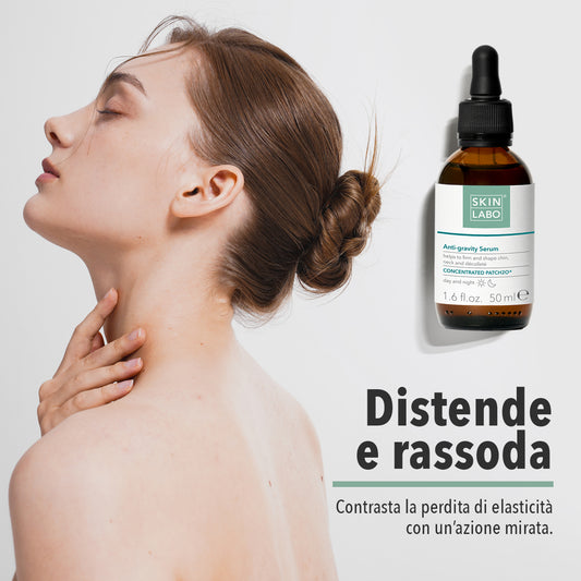 Complete the skincare by applying a few drops of the Anti-Gravity Serum (5) to the cleansed skin of the chin, neck and décolleté, and massage gently with wide movements until completely absorbed.