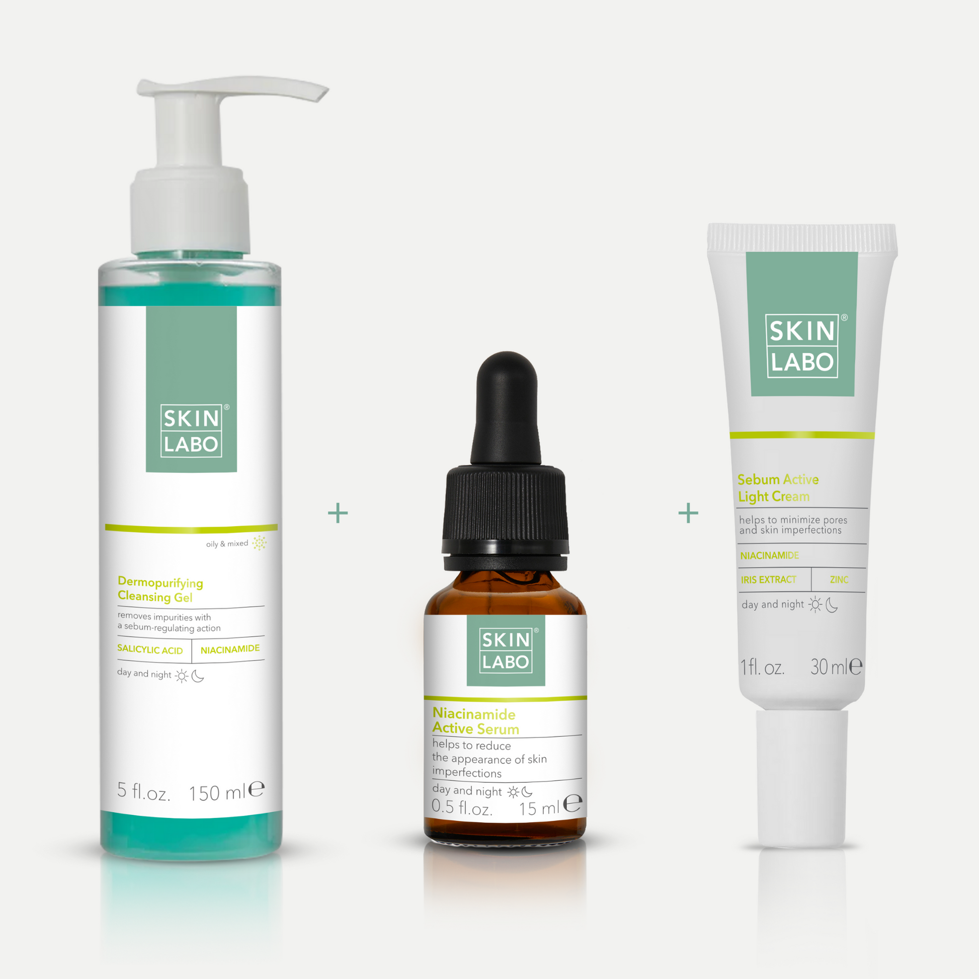 DERMOPURIFYING CLEANSING GEL + NIACINAMIDE ACTIVE SERUM + SEBUM ACTIVE LIGHT CREAM