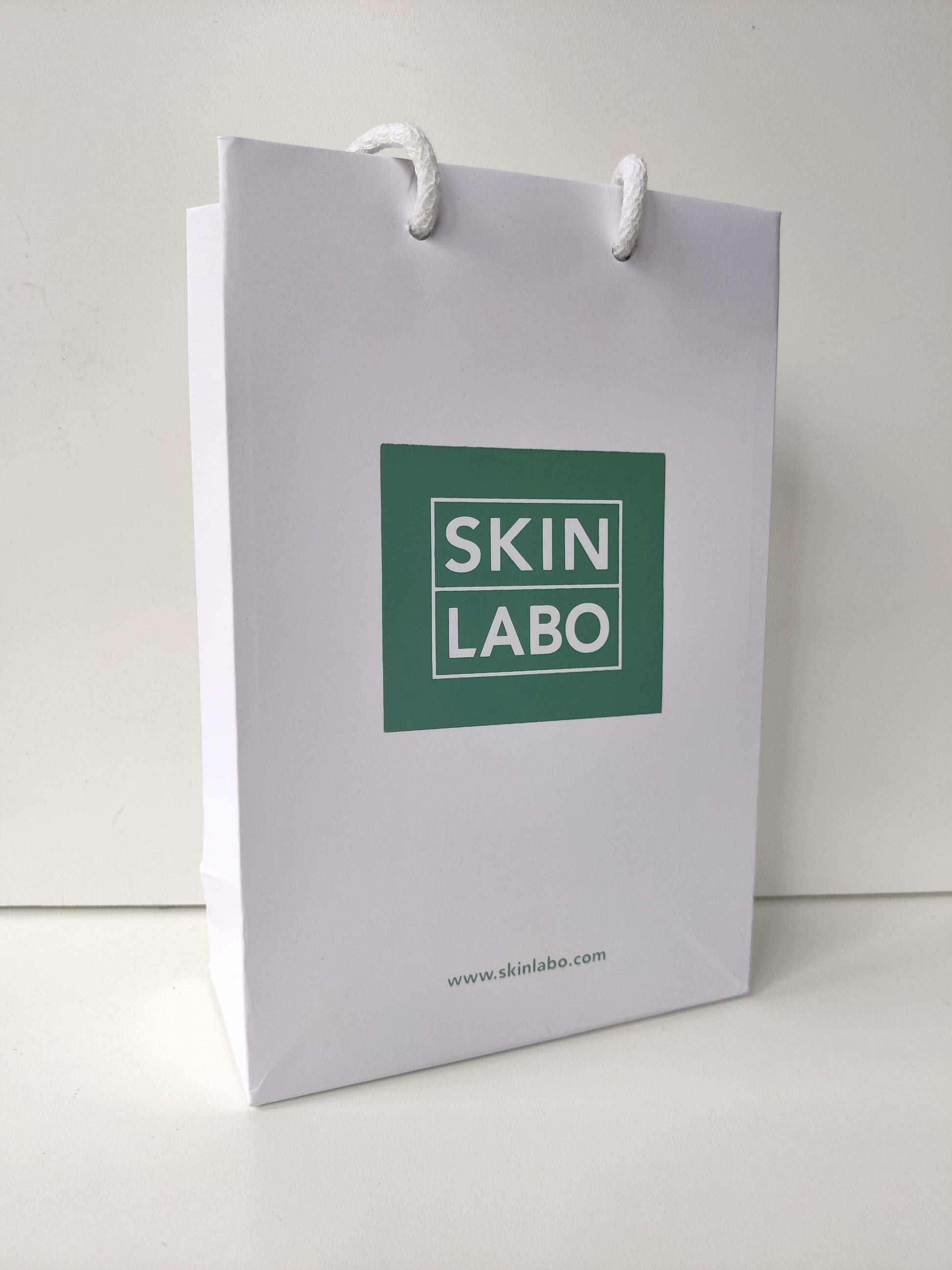 SkinLabo Shopper in matt white paper, with white cotton handle and logo on both sides.